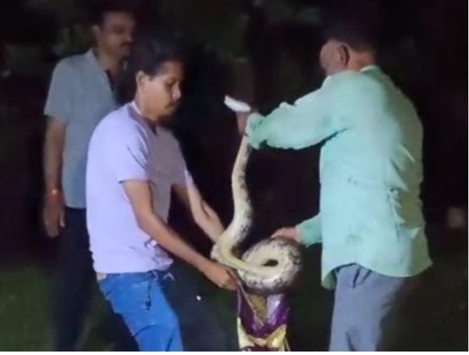 बुरहानपुर: मध्य प्रदेश के बुरहानपुर जिले में एक विशाल अजगर निकला है। जिला मुख्यालय से 25 किलोमीटर दूर नेपानगर में नेपा लिमिटेड के रेस्ट हाउस में यह बड़ा अजगर निकला है। देखते ही रेस्ट हाउस में हड़कंप मच गया है। इसके बाद स्नैक कैचर को सूचना दी गई। कैचर ने सांप को पकड़ लिया है। सांप इतना बड़ा था कि उसे उठाने में दो लोग लगे हैं। इसके बाद जंगल में छोड़ा गया है।