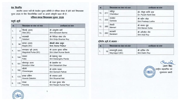 नई सूची के अनुसार, सिताई सीट से आशुतोष वर्मा नाटाबाड़ी से गिरिजा शंकर रॉय, बागदा से सोमा ठाकुर, मगराहाट पूर्व से उत्तम कुमार बनिक और फालटा से देबांगशु पांडा को टिकट दिया गया है। वहीं सोनारपुर उत्तर से देबाशीष पाठक, हावड़ा दक्षिण से श्यामल हाती, पंचला सीट से रंजन कुमार पॉल, चंडीपुर से पीयूष कांति दास, गारबेटा से प्रदीप लोढ़ा, मेमारी से मानव गुहा और बाराबनी सीट से अरिजीत रॉय भाजपा उम्मीदवार होंगे।