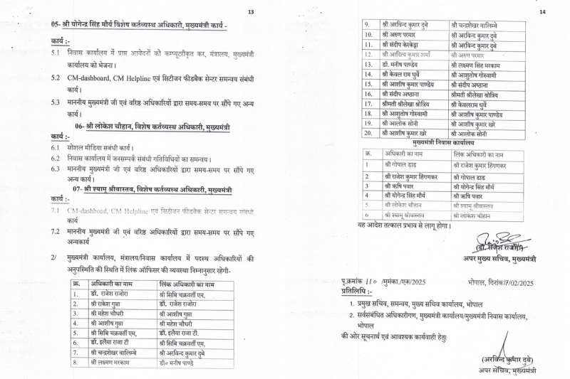 अरविंद दुबे, अपर सचिव: एसीएस डॉ.राजेश राजौर को रिपोर्ट करते हुए उनके काम भी देखेंगे। साथ ही विधानसभा के काम और मुख्यमंत्री की बैठकों के लिए चर्चा के बिंदु तैयार करेंगे।